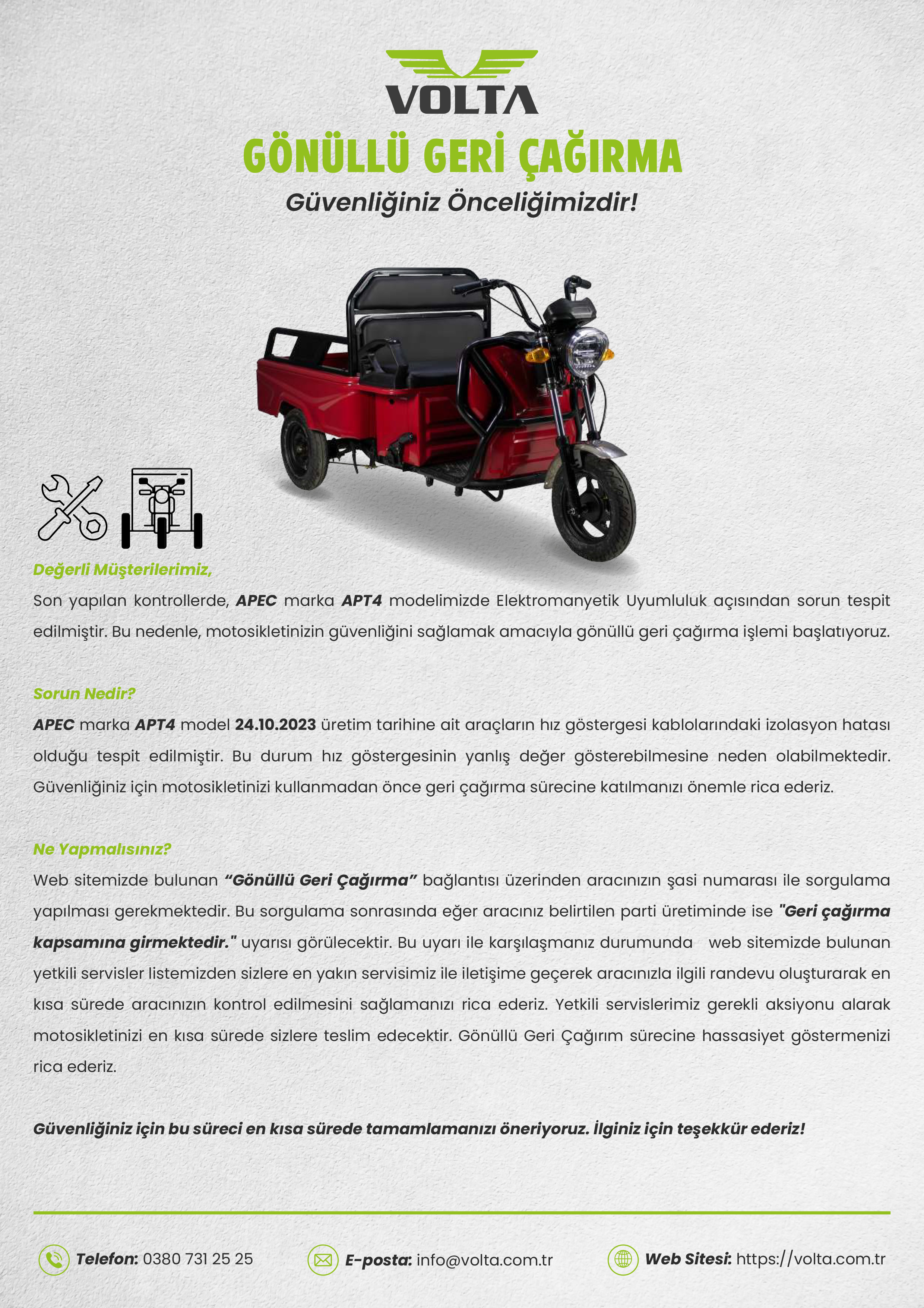 Yapacağınız işlemin doğru şekilde tamamlanabilmesi için, kişisel bilgilerinizi eksiksiz ve gerçeğe uygun biçimde girmeniz gerekmektedir. Eksik ya da hatalı bilgi girişi durumunda gönüllü geri çağırma kapsamında planlanan işlemler aracınız için uygulanmasını engelleyebilir.
